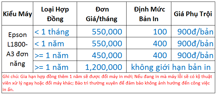 – Giá thuê chiếc máy in Epson L1800 chỉ khoảng hơn 500.000 vnđ/tháng quý khách đã có trọn bộ máy in để in ấn với những giá trị kèm theo (bảo trì máy in trọn cả hợp đồng thuê, không cần chi phí nhân lực để quán lý máy in vì chúng tôi chính là người quản lý cho bạn, được cung cấp mực in và giấy in với giá sỉ khi thuê máy của chúng tôi, được thay thế linh kiện máy miễn phí…..).