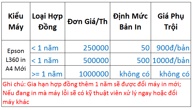 BẢNG GIÁ CHO THUÊ MÁY IN MÀU EPSON L360