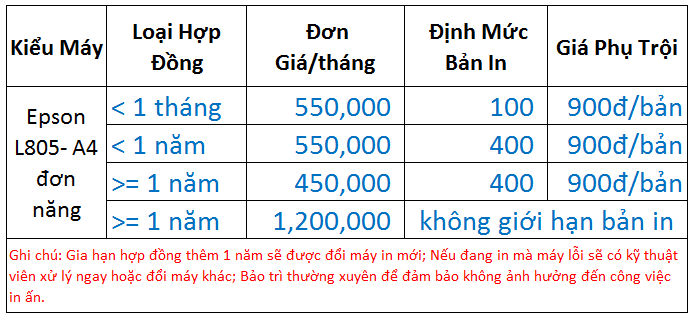 – Giá thuê chiếc máy in Epson L805 chỉ khoảng hơn 500.000 vnđ/tháng quý khách đã có trọn bộ máy in để in ấn với những giá trị kèm theo (bảo trì máy in trọn cả hợp đồng thuê, không cần chi phí nhân lực để quán lý máy in vì chúng tôi chính là người quản lý cho bạn, được cung cấp mực in và giấy in với giá sỉ khi thuê máy in của chúng tôi, được thay thế linh kiện máy miễn phí…..).